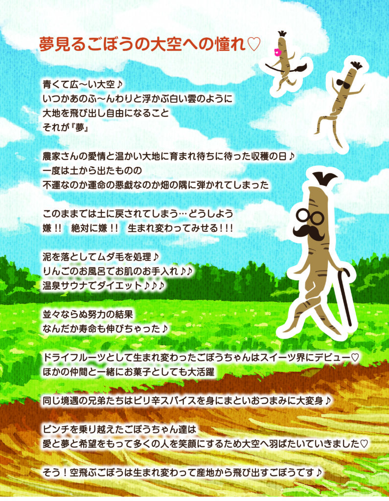 金渕さんは、規格外ごぼうを使った商品の実現に向けて様々考えていたようだが残念ながら手間やコストの問題で実現できていない。しかし、空飛ぶごぼうのストーリーは、そんな規格外ごぼうを思いながら作られたのだ。